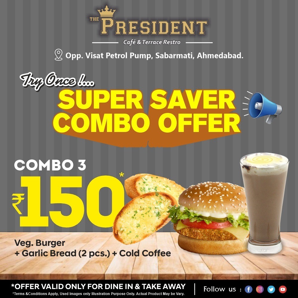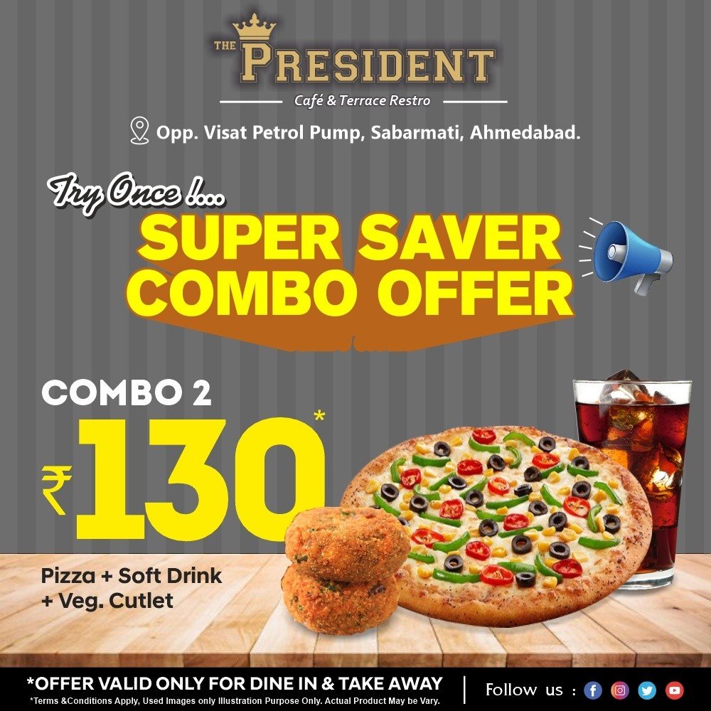 The president cafe & terrace restro is a qurikiest cafe in ahmedabad with an enthralling menu. We serve flavorsome food like pizza,burger,sandwich and many more available in our menu. We famous for our diverse range of luscious mocktails and milkshakes. Apart from this we have wide ranging list of snacks and beverages of quick bites blow your mind with happiness,We also have delectable cheesy garlic bread and mouthwatering grilled italian sandwich,crumble frech fries topped with flavoured mayonnaise and hot pizza with cheese oozing out of it.